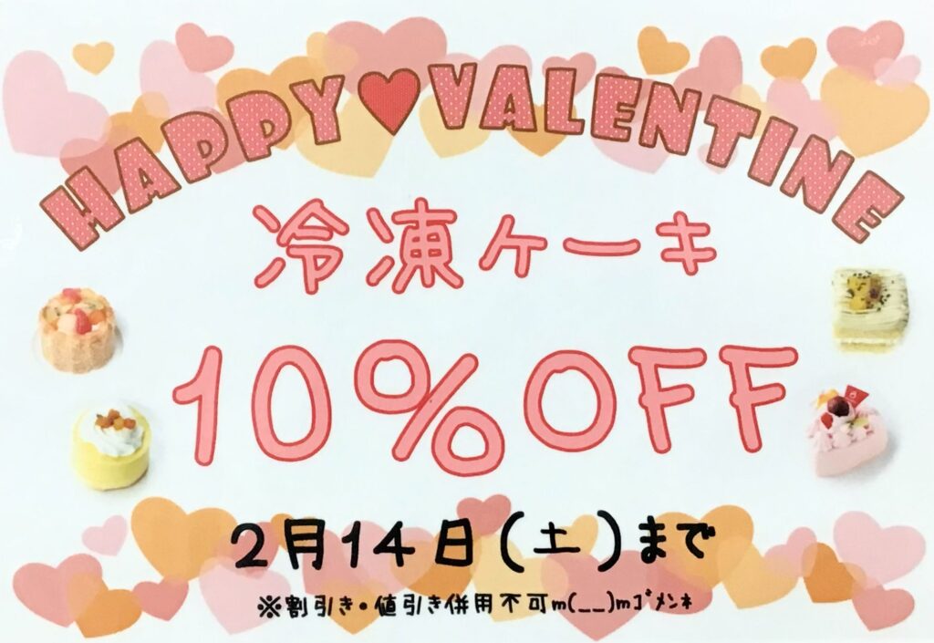 只今、バレンタインキャンペーン 冷凍ケーキ10%OFFを行っています♪
